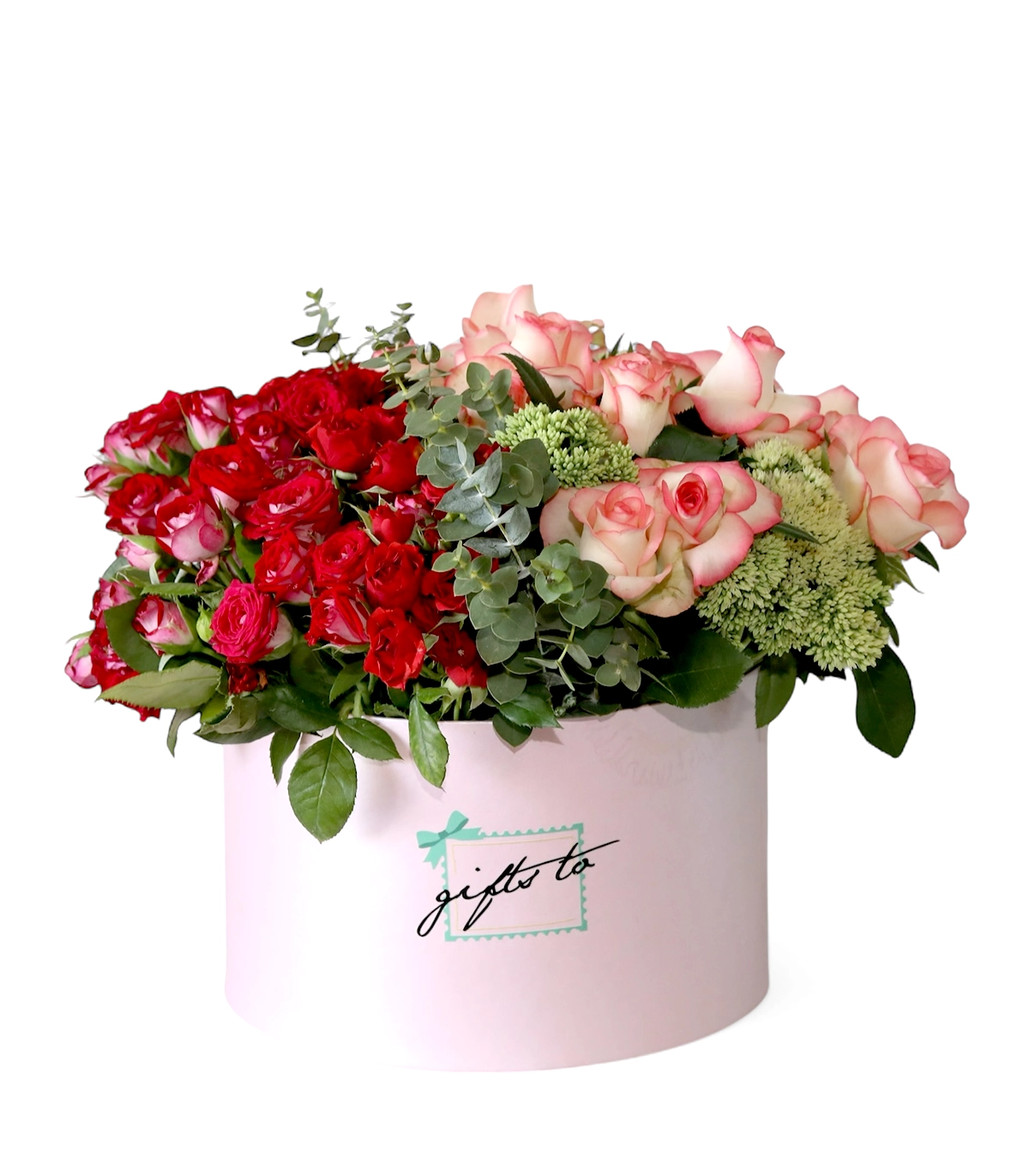 A beautiful balance of passion and sweetness, this arrangement showcases a mix of red baby roses and soft pink roses — about 20 roses in total — elegantly arranged in a pink cylinder box.