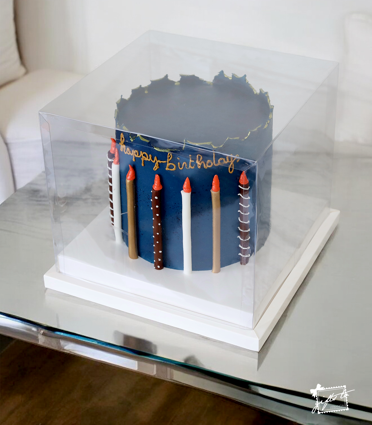 Make their birthday shine with the Birthday: Candlelit Celebration, a stunning navy blue birthday cake, elegantly presented in a see-through cubic gift box. Designed to serve 12-14 people, this sophisticated cake features a deep navy blue sugar paste coating with elegant candle stick designs, symbolizing warmth, wishes, and celebration.