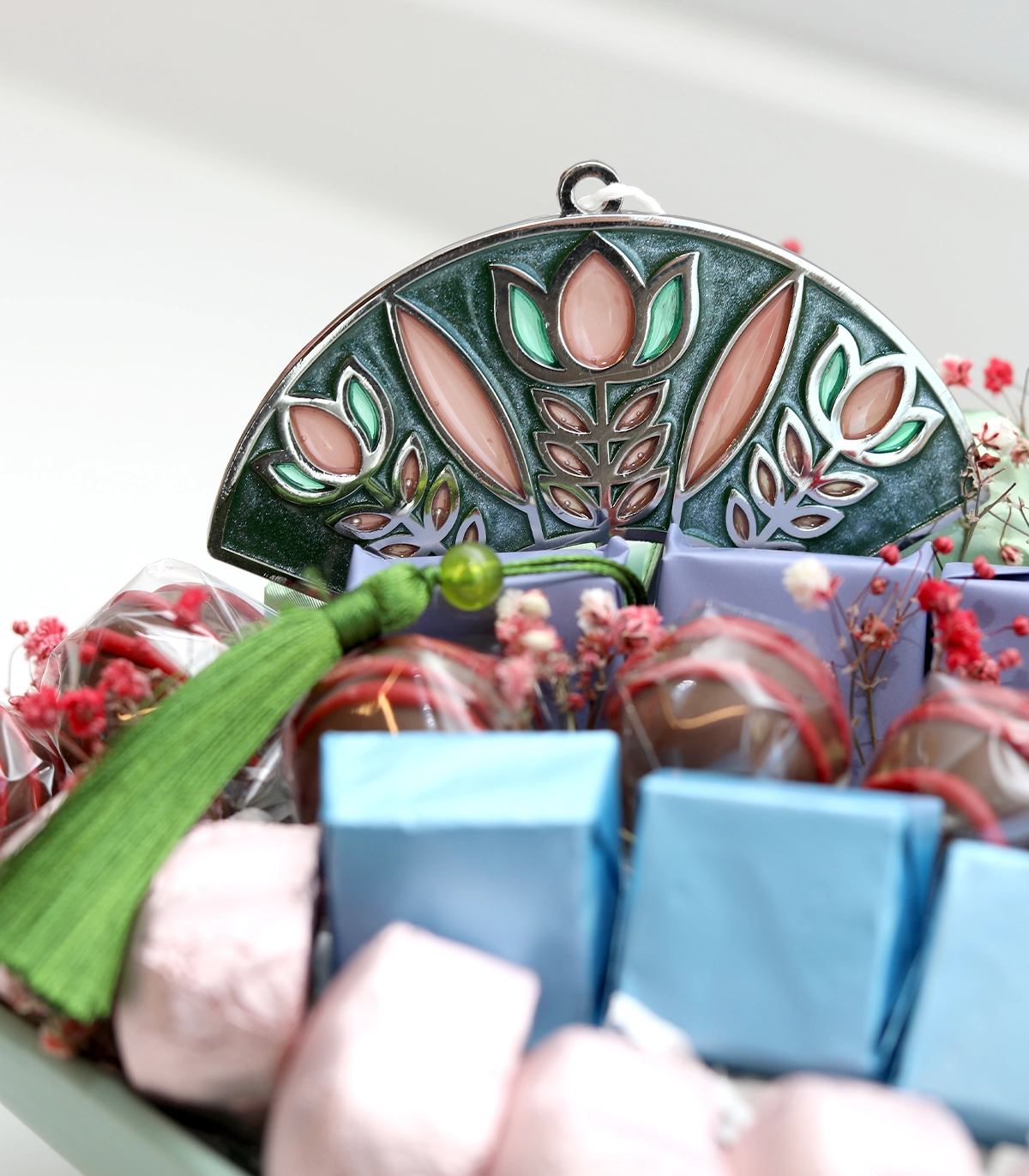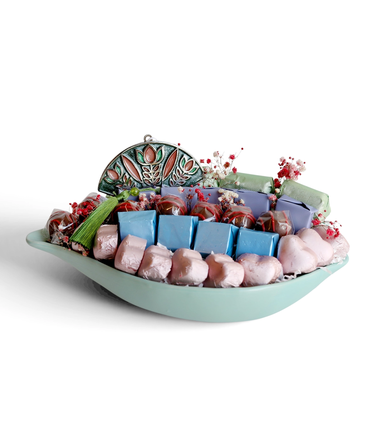 A beautifully arranged chocolate selection presented in a chic ceramic leaf bowl, blending artisanal design with sweet indulgence. Finished with a decorative ornament inspired by the iconic Shaffeh motif, this elegant arrangement makes a unique and stylish gift.