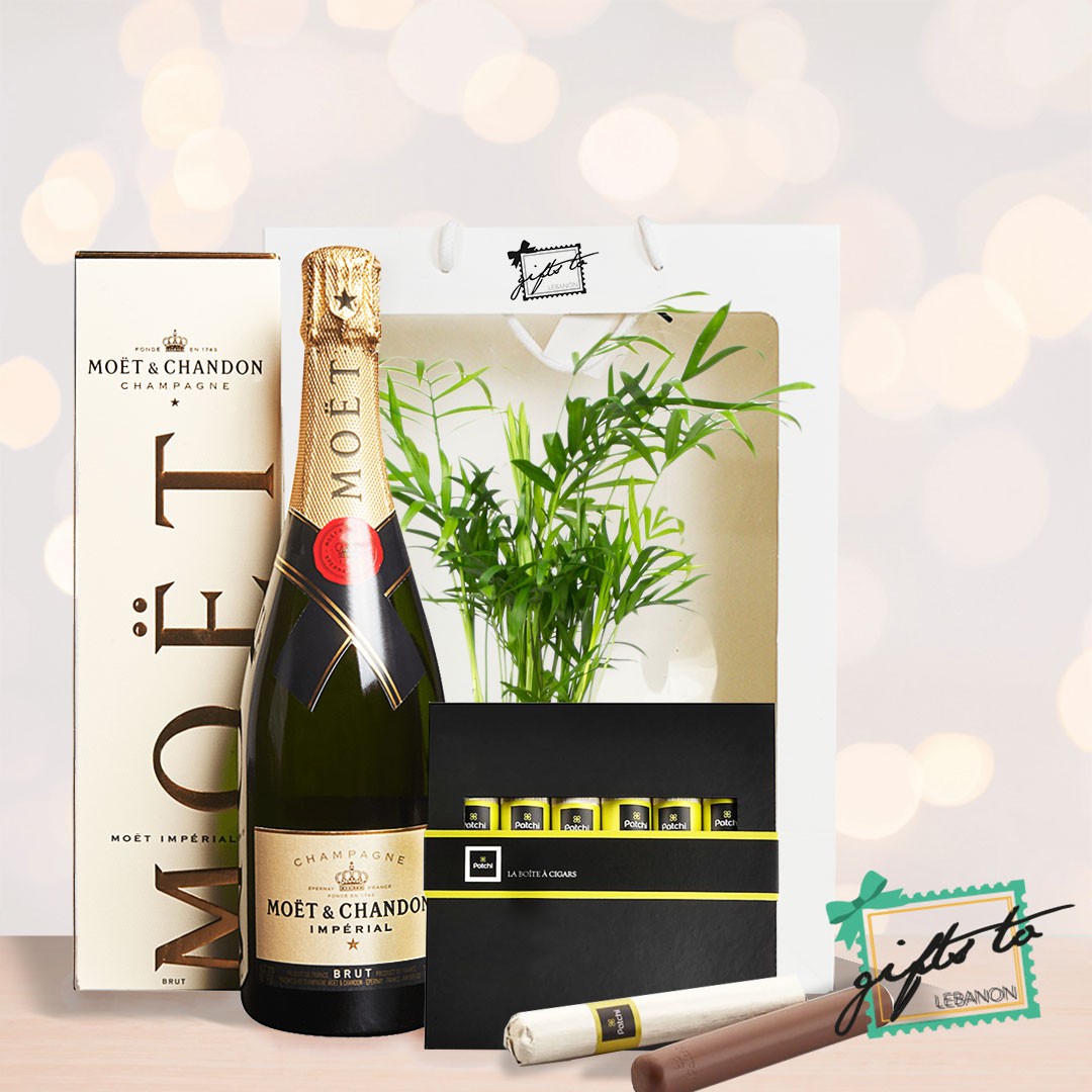 Raise a toast to the finer things in life with a bottle of exquisite Moët Champagne, known for its impeccable taste and effervescence. Accompanying this indulgent drink are decadent Patchi chocolate cigars, crafted with the finest ingredients to provide a rich flavor experience.