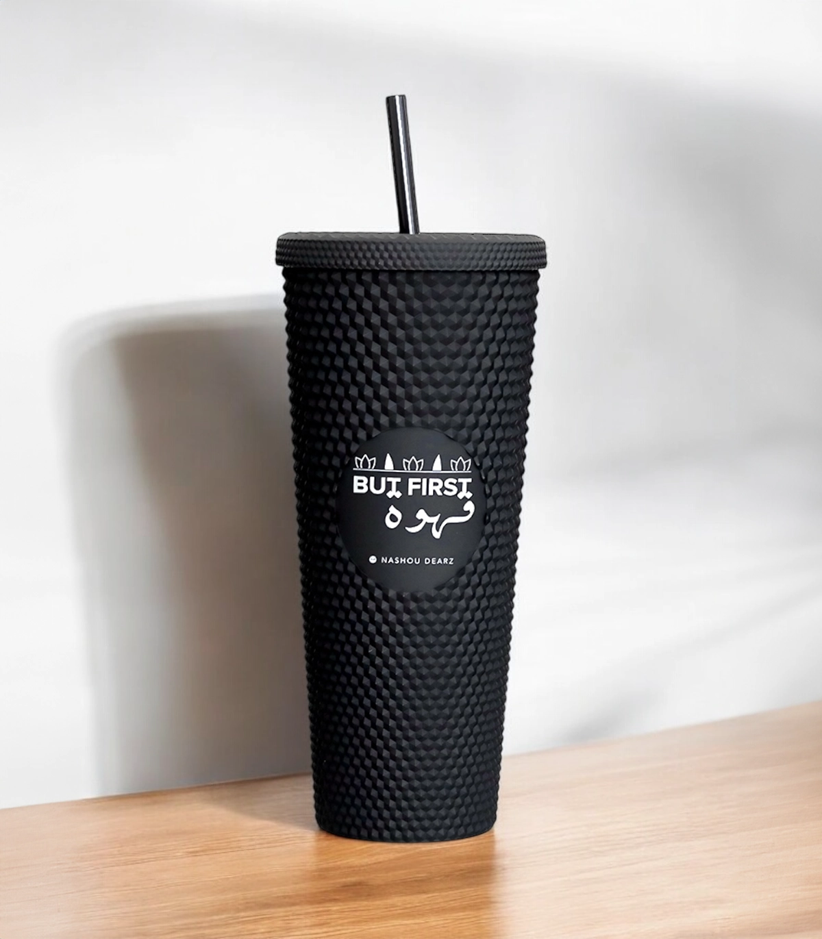 • “Bui First قهوة” textured tumbler with straw – reusable statement cup for coffee lovers