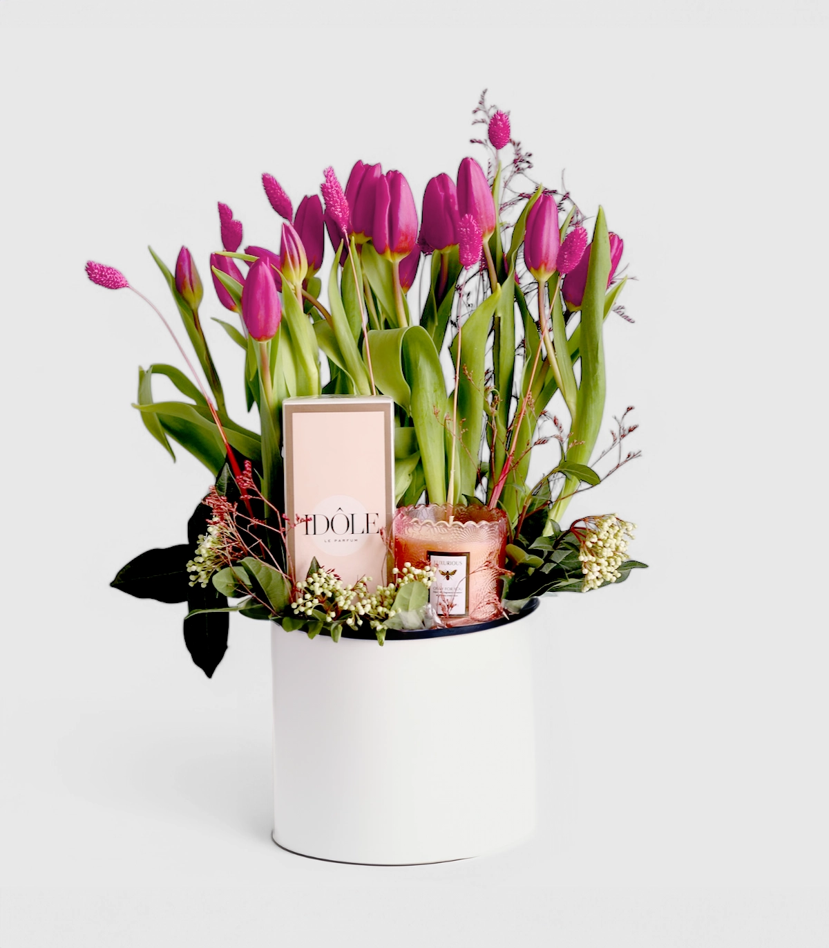 A luxurious and sophisticated gift that blends floral beauty with timeless fragrance. The Tulip Elegance with Lancôme Idôle Gift Arrangement is a stunning way to celebrate a special woman in your life.