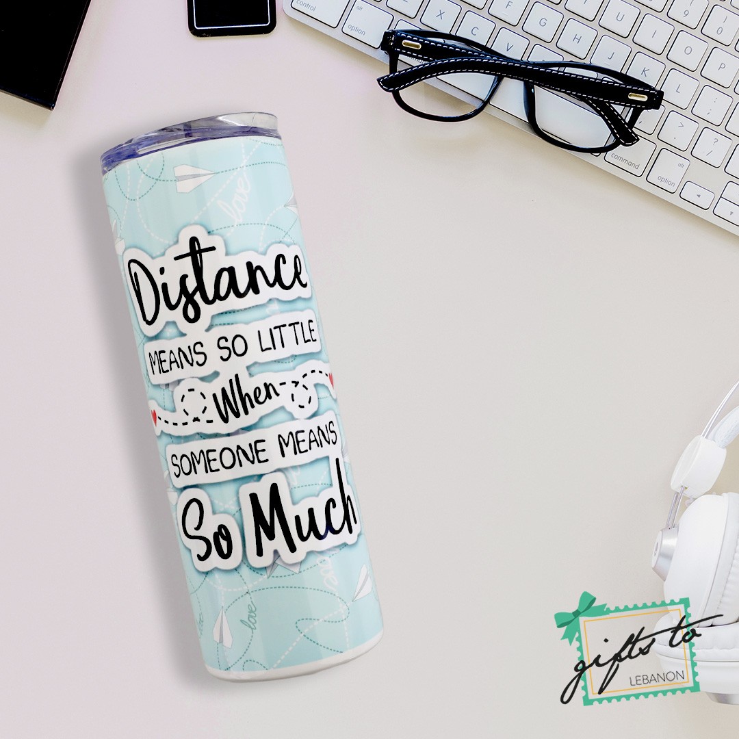 Stainless steel tumbler with the message: “Distance Means So Little When Someone Means So Much” – a daily reminder of your bond