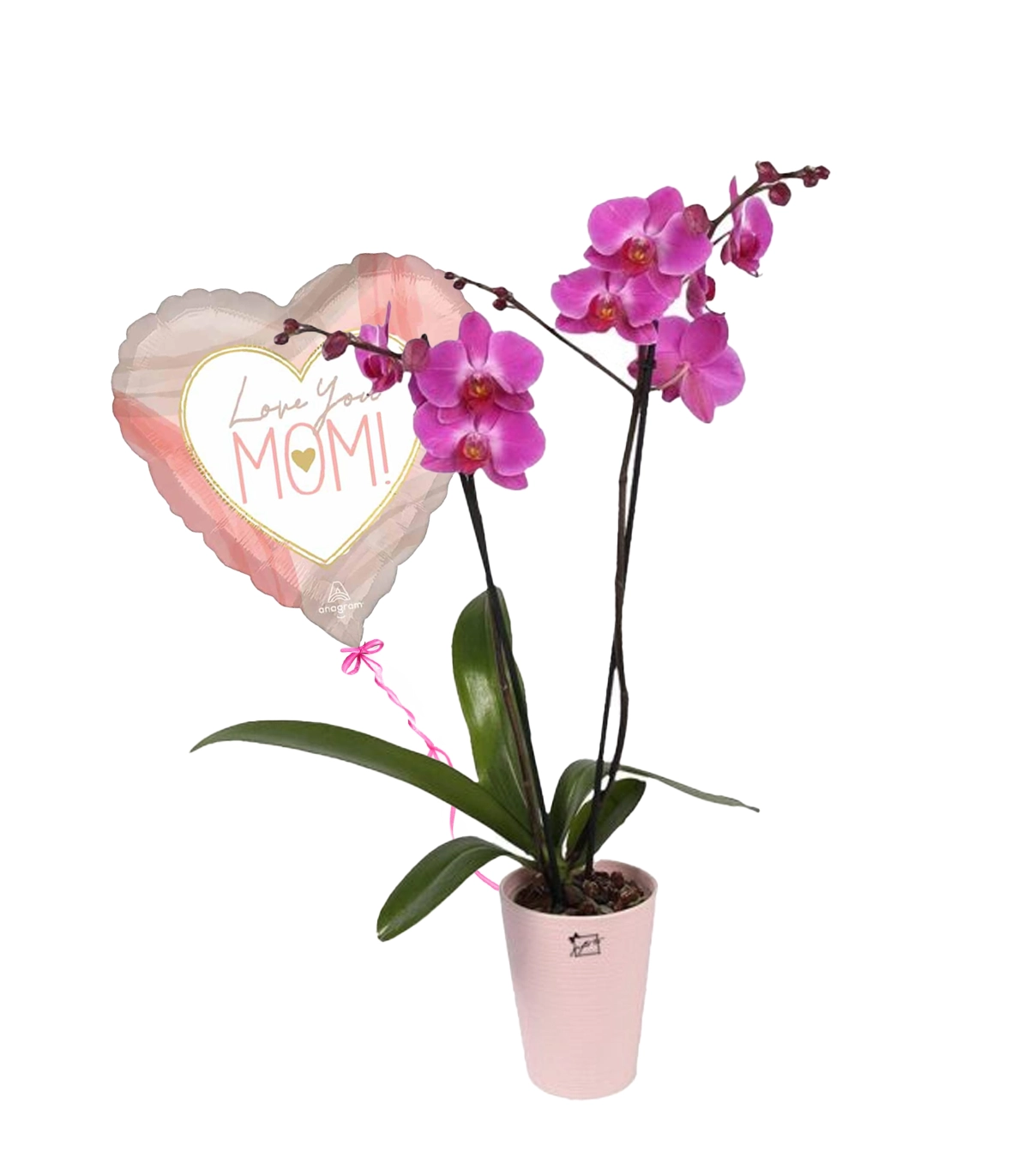 A perfect expression of love for your mom. This bundle features a beautiful double-stemmed purple orchid in an elegant ceramic pot, paired with a vibrant Love You Mom helium balloon to bring a smile to her face.