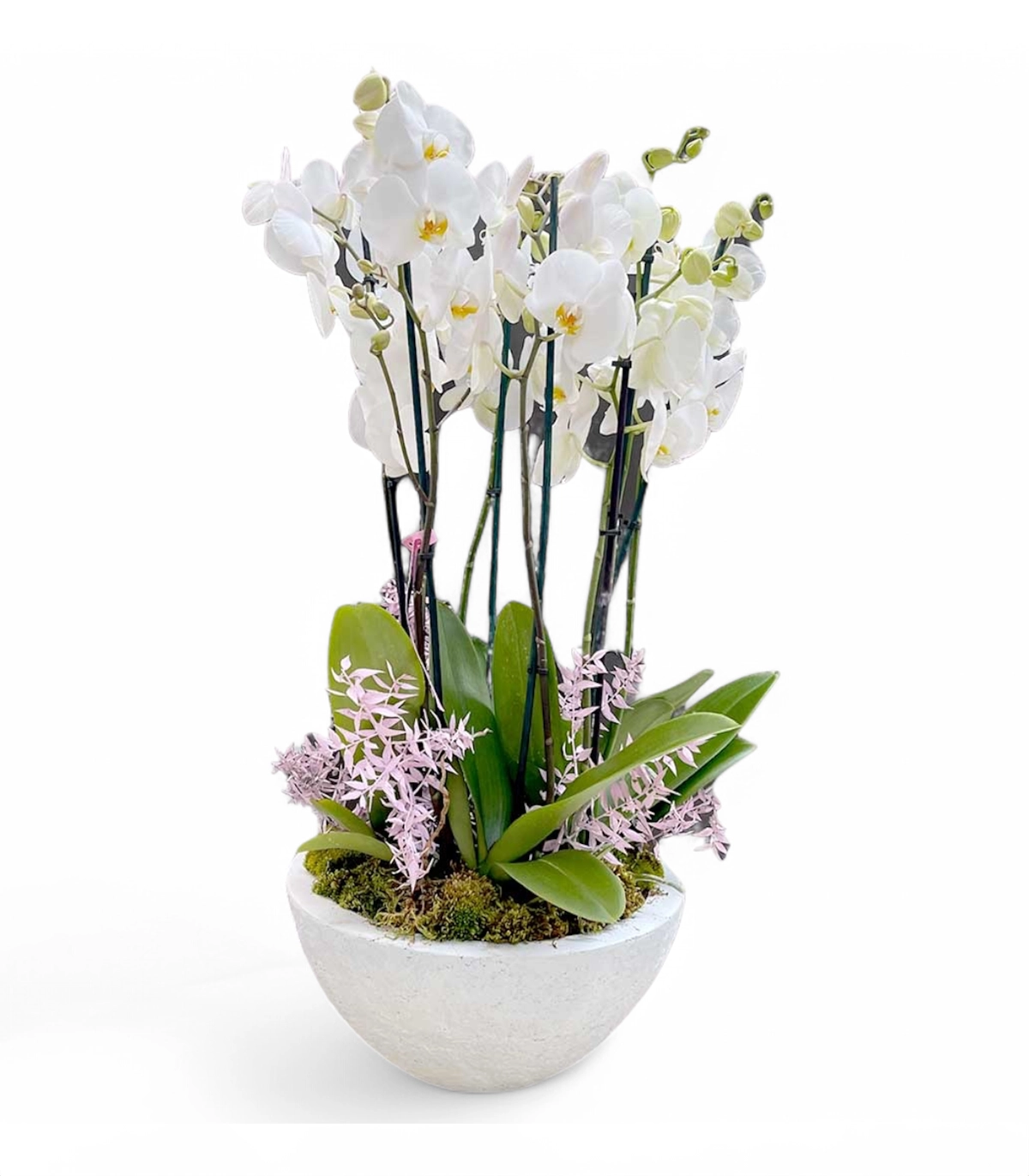 A stunning symbol of purity and grace, this elegant white orchid arrangement features 6 stems of exquisite white orchids beautifully placed in a sleek white ceramic pot. A perfect gift to celebrate life’s special moments, whether it’s a wedding, a new arrival, Mother’s Day, or any occasion that deserves to be celebrated.