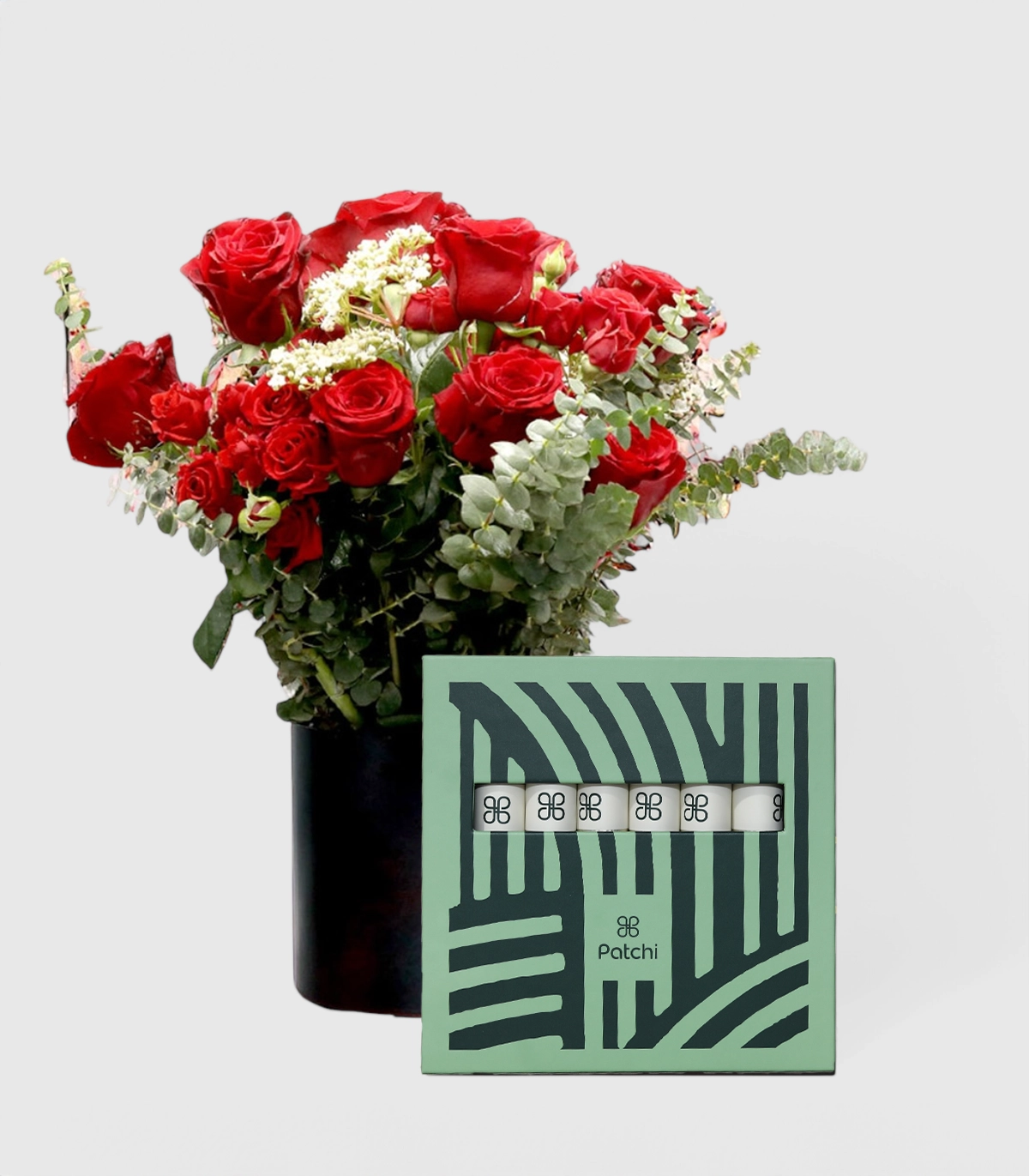 Indulge in the perfect blend of elegance and sweetness with this exquisite gift set. A stunning arrangement of fresh premium red roses and delicate seasonal flowers beautifully presented in a chic round box, paired with the luxurious Patchi Le Barons chocolate gift box for an unforgettable gesture of love and appreciation.