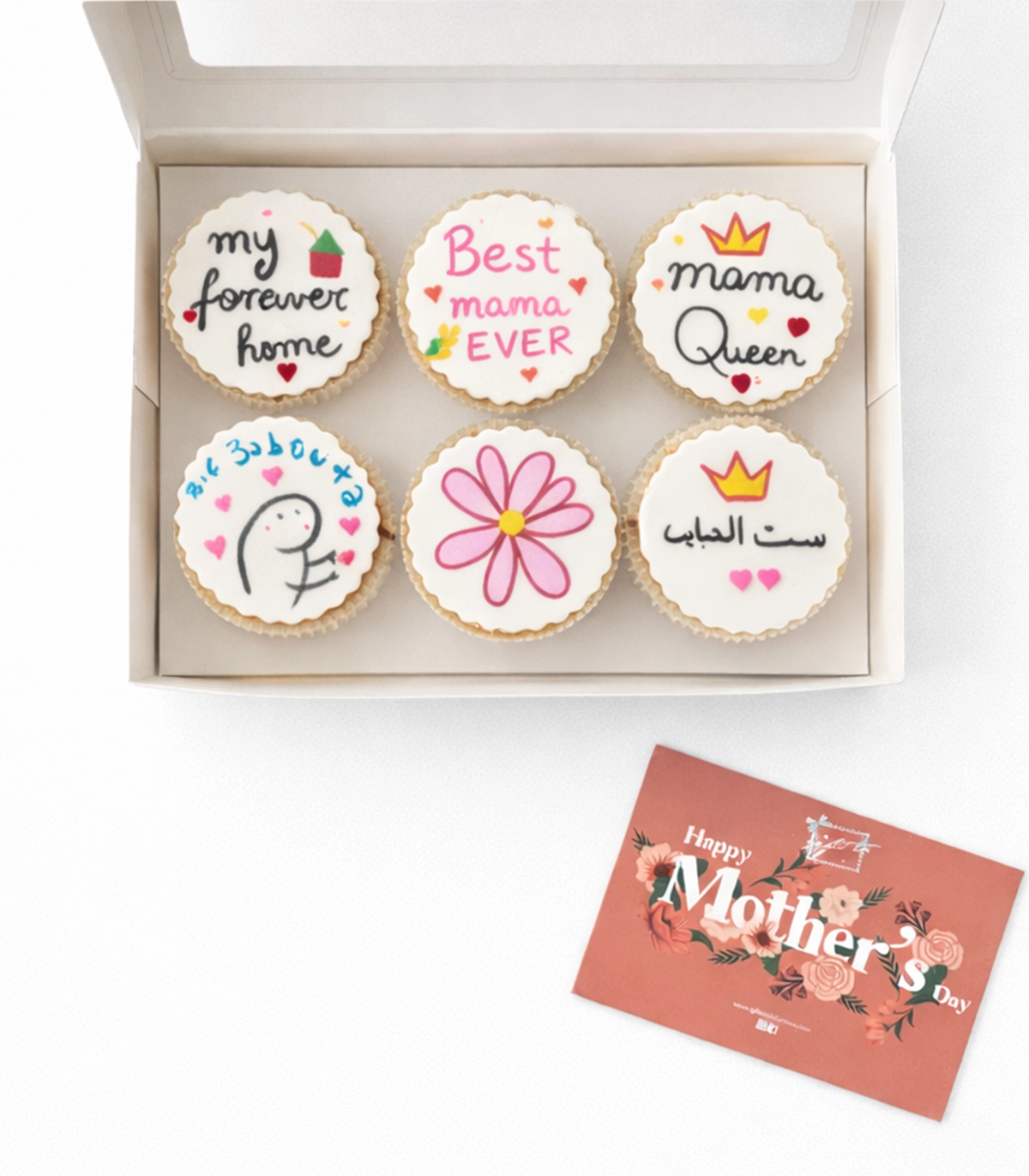 A sweet and thoughtful box of handcrafted cupcakes decorated with adorable illustrations and loving messages for Mom. Each cupcake adds a heartfelt touch, making it a delightful surprise to celebrate her special day.