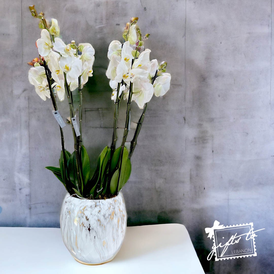 Grace meets opulence with our 8 stem orchid arrangement in a stunning marble-patterned vase. A timeless gift for every occasion. Exquisite beauty, delivered.