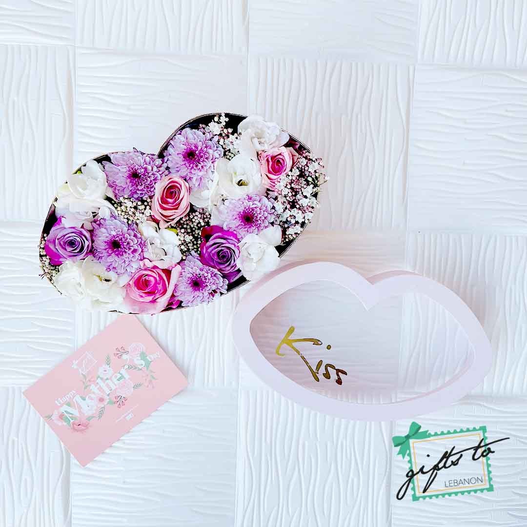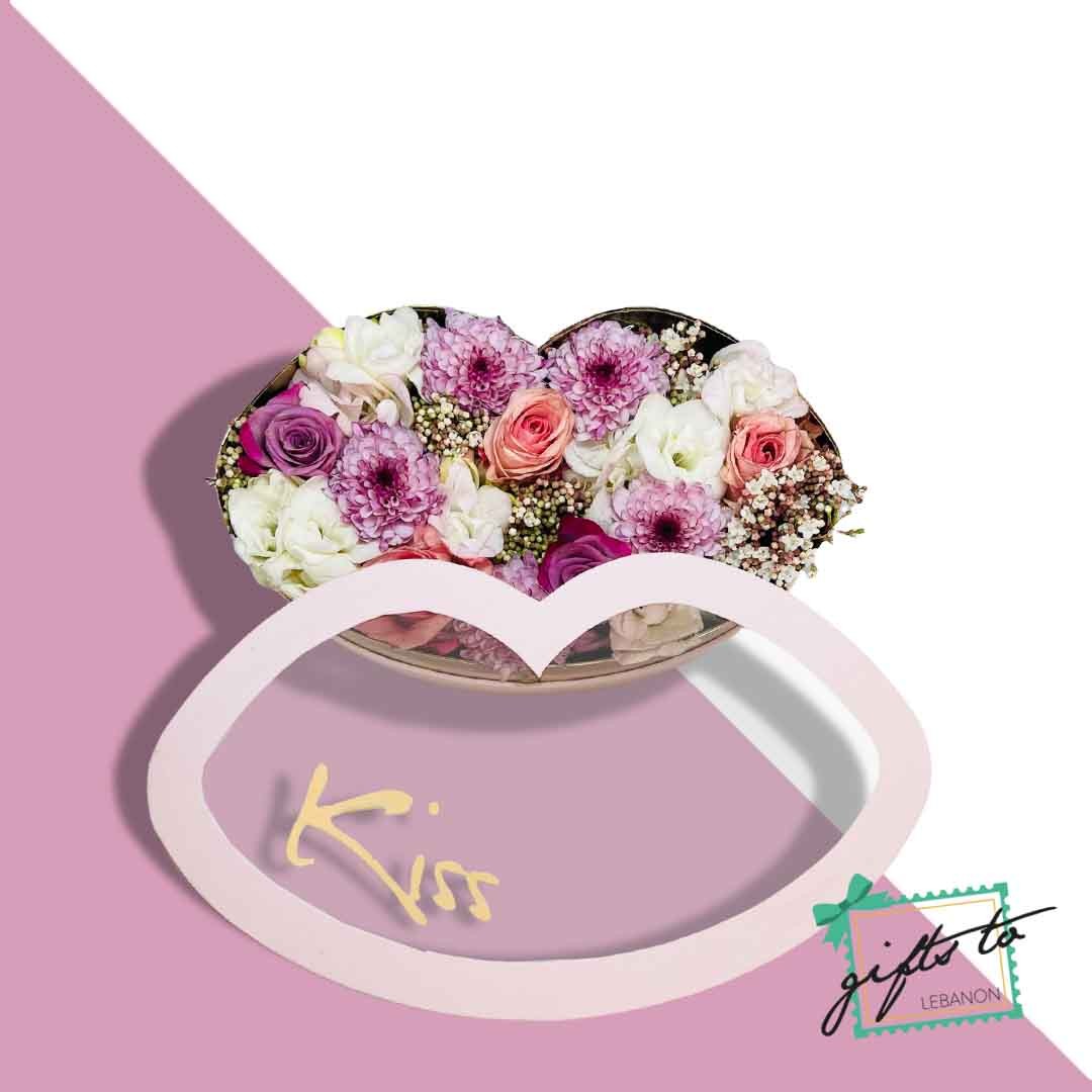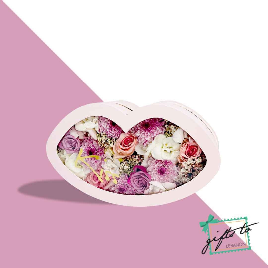 Lips shaped pink box including a mix of seasonal pink flowers.
