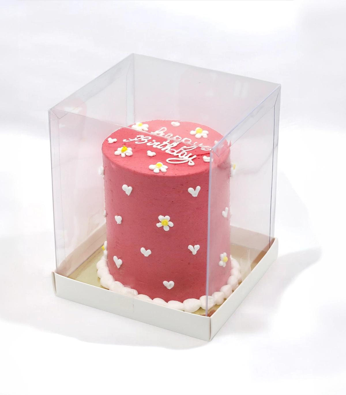 - Mini Pink Birthday Cake (Serves 2-4) – A beautifully decorated pink cake with hearts and daisy flowers, featuring “Happy Birthday” in the center. Choose your preferred filling: