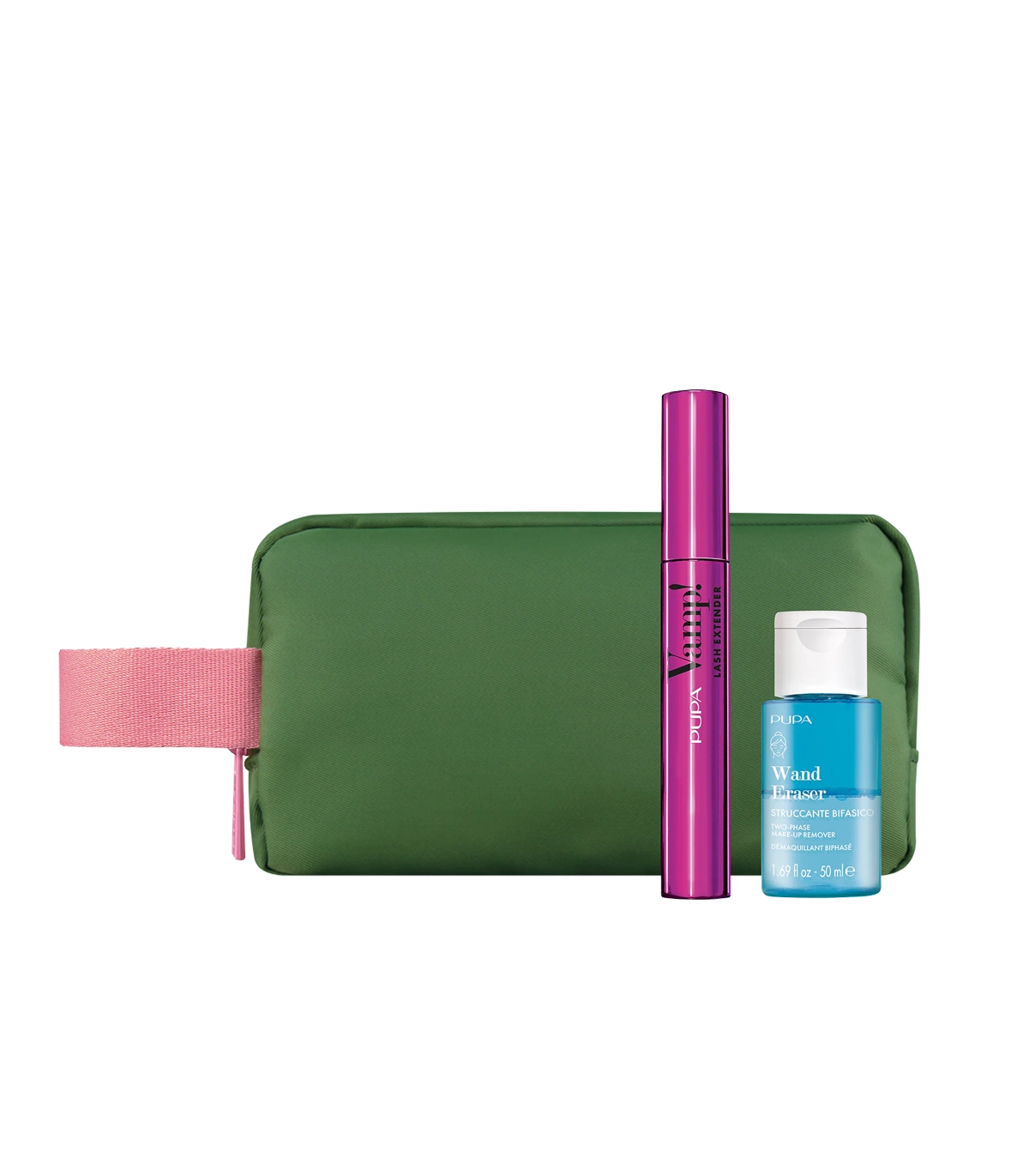 PUPA Milano makeup set – includes mascara, eye makeup remover, and a chic green cosmetic pouch.