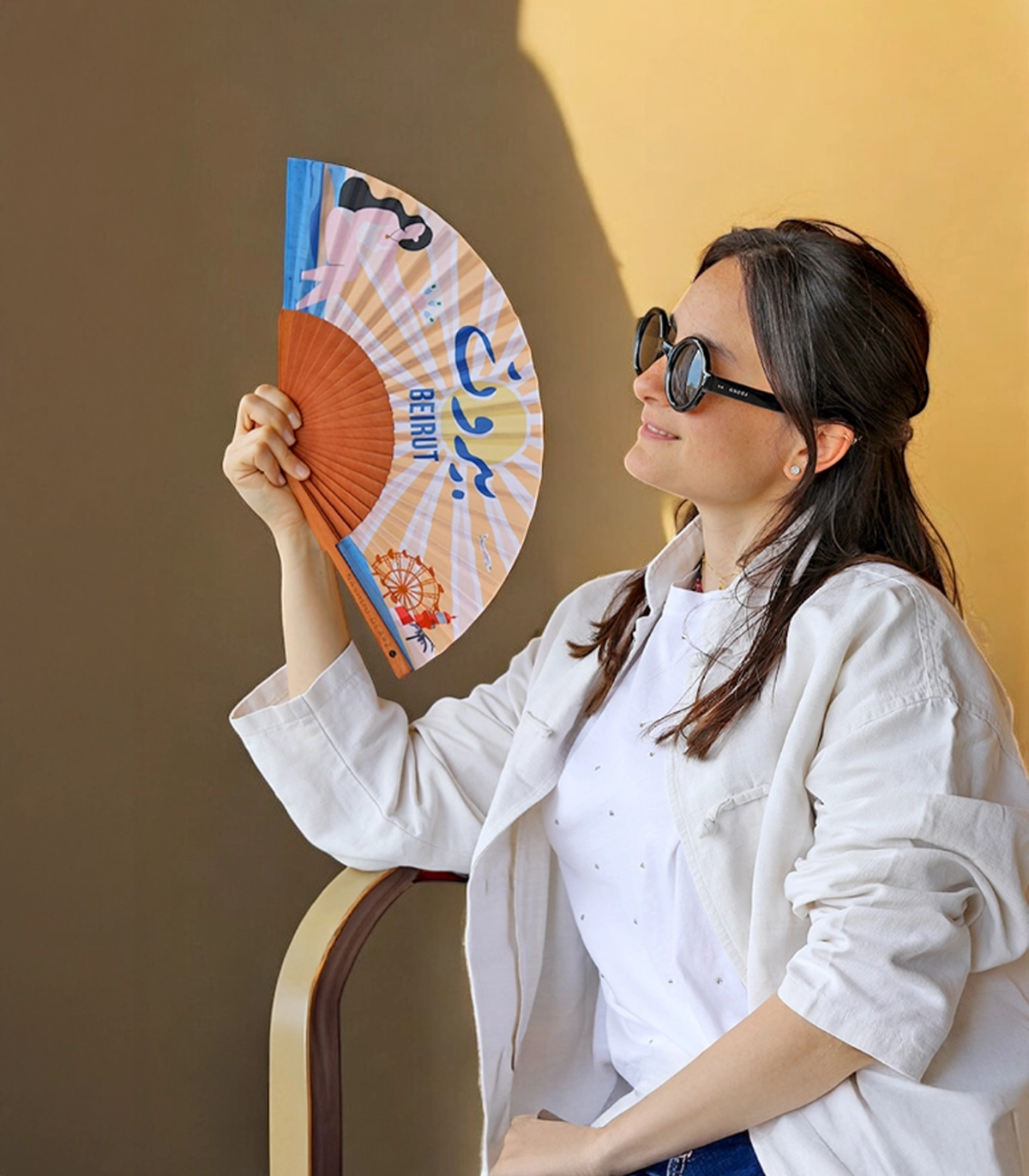 The Retro Beirut Hand Fan is a nostalgic breeze from a bygone era, paying tribute to the golden summers of Beirut’s coastline. With a soft retro palette and a charming illustration of Ain El Mrayseh, this design captures the magic of a time when strolls by the sea were a daily ritual. At the center, a graceful woman holds a hand fan adorned with the classic Shaffeh pattern — a nod to both elegance and cultural identity.