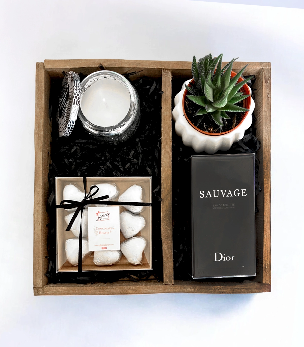 Immerse your loved one in a world of harmonious sensory experiences with this luxurious gift ensemble that combines the iconic Dior Sauvage EDT, scented candle, delectable chocolate heart, and a beautiful succulent plant.