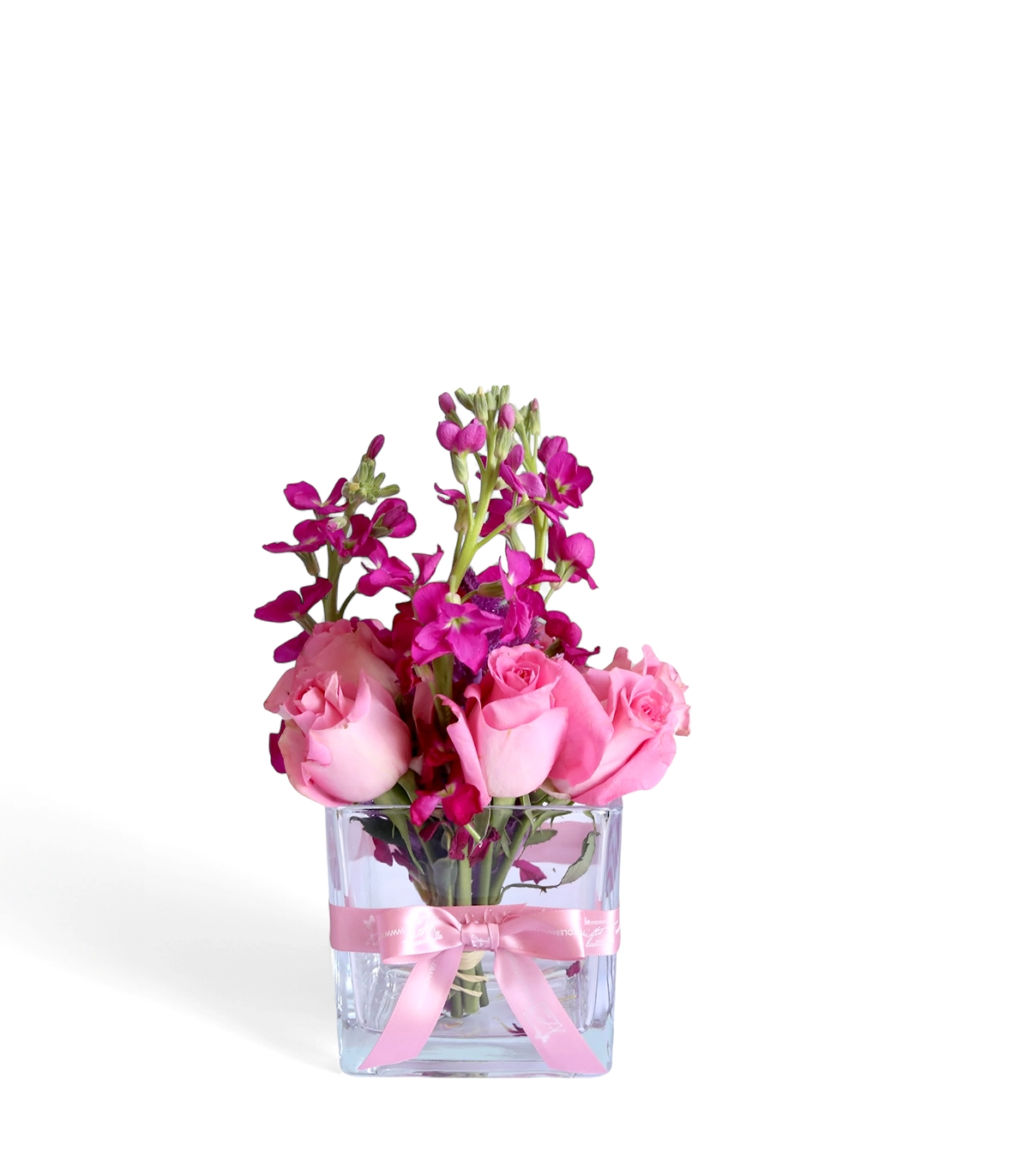 A delicate and timeless arrangement, the Simply Pink Vase features 8 elegant pink roses beautifully arranged in a modern square-shaped cube vase (12cm).