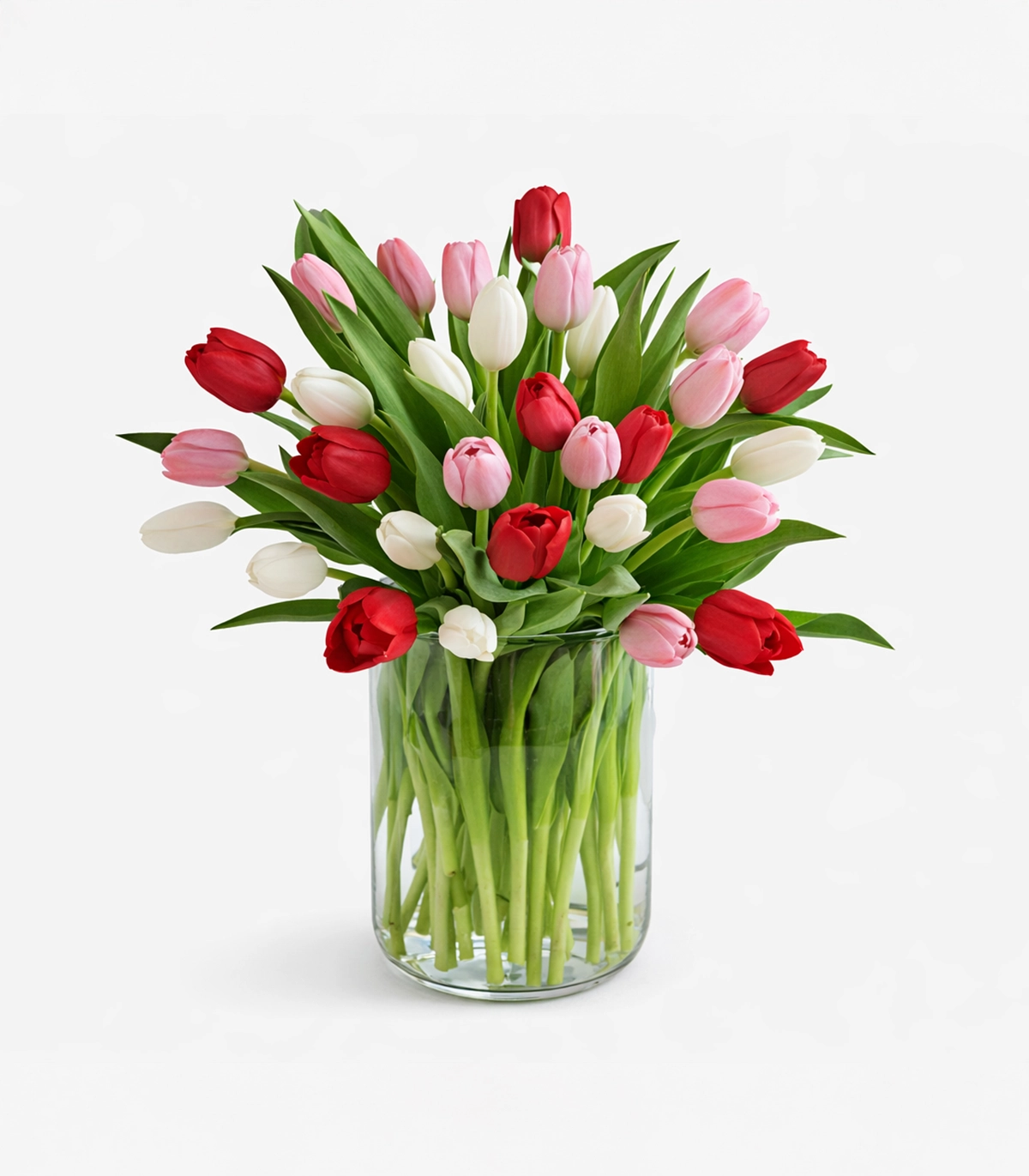 A fresh and vibrant arrangement of mixed tulips in soft shades of red, pink, and white, beautifully displayed in a clear glass vase. A joyful composition that brings color, warmth, and elegance into any space.