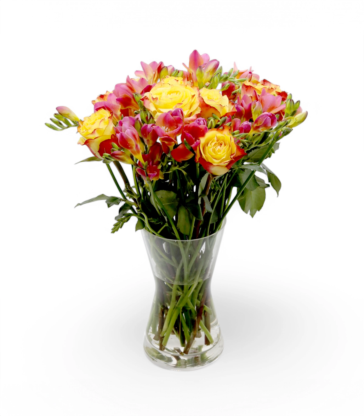 A radiant and heartwarming floral arrangement that brings together the beauty of 10 vibrant yellow roses and delicate pink freesias in an elegant glass vase. The perfect combination of warmth and charm, this bouquet is ideal for brightening any space and making someoneβs day extra special.